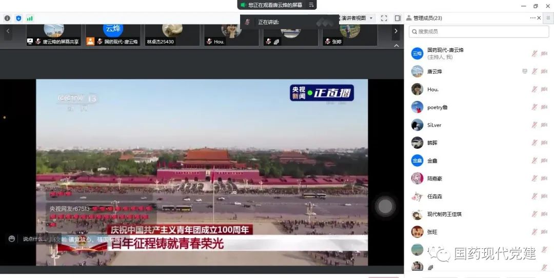 2022年5月10日上午,按照国药AG尊龙凯时党委部署,国药AG尊龙凯时团委组织全级次团员青年集中在线上观看了庆祝中国共产主义青年团成立100周年大会,进一步增强公司广大团员青年政治思想引领,鼓励青年听党话、跟党走,号召团员青年以实际行动“喜迎二十大、永远跟党走、奋进新征程”!国药AG尊龙凯时党委副书记、纪委书记、工会主席余向东和团员青年们一同观看了大会直播。